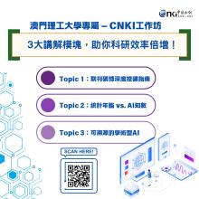 Date & Time Wednesday, 15 October 2025, 14:00 - 15:30 Platform Zoom (Please download and install the software before signing up your personal account.) Content Macao Polytechnic University — CNKI Online Workshop: Three Key Modules to Boost Your Research Efficiency! Topic 1:... more